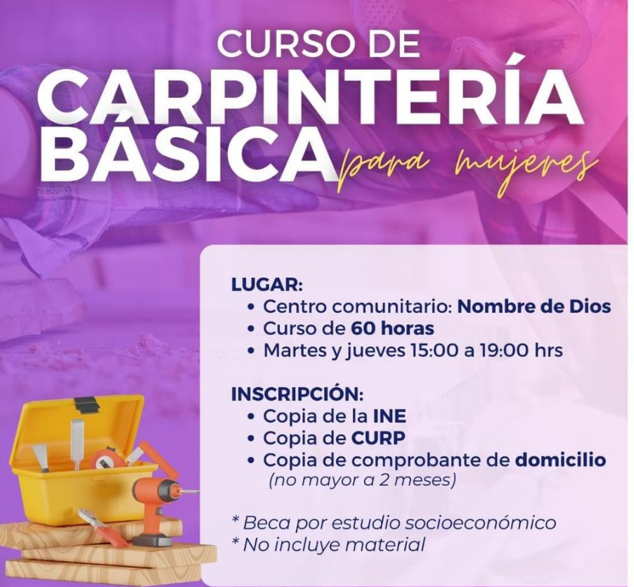 El curso se desarrolla en el Centro Comunitario de la colonia Nombre de Dios, los días martes y jueves de 3:00 a 7:00 de la tarde, con una duración total de 60 horas. Además, se anuncia la posibilidad de obtener becas que cubren el 100% de las clases y los materiales, sujeto a estudios socioeconómicos.