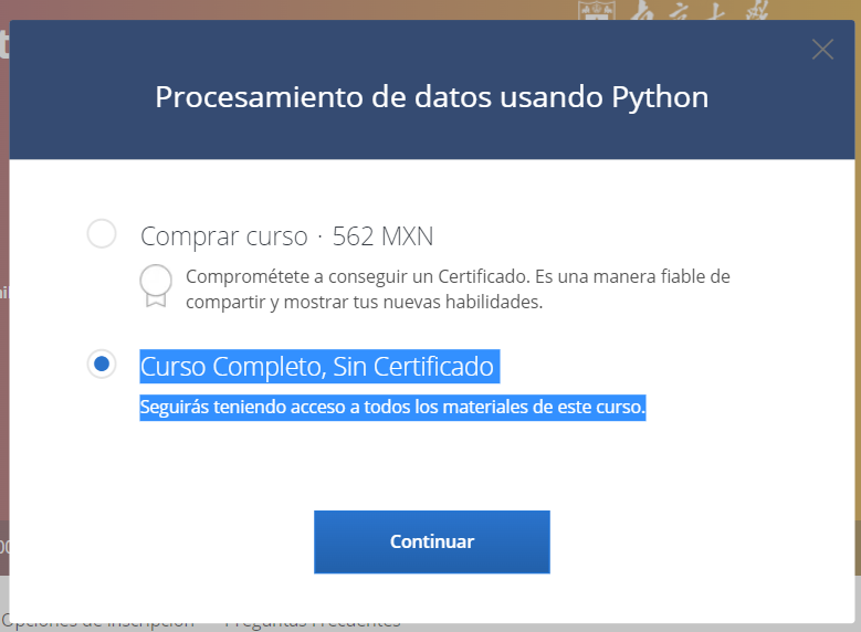 La primera opción es elegir la opción de “Curso gratuito sin certificado”, de esta manera podrás acceder al contenido del curso y finalizarlo, pero no podrás obtener un certificado de finalización avalado por la plataforma.