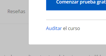 La segunda opción es elegir “auditar curso”, con esta opción podrás acceder al contenido de video del curso, pero no podrás realizar los exámenes ni obtener el certificado de finalización. Si no ves la opción de auditar curso, debes verificar en la parte de abajo usando el scroll (en forma de link).