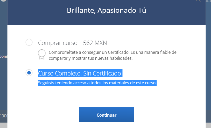 La primera opción es elegir la opción de “Curso gratuito sin certificado”, de esta manera podrás acceder al contenido del curso y finalizarlo, pero no podrás obtener un certificado de finalización avalado por la plataforma.
