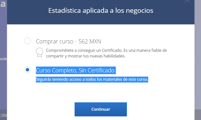 La primera opción es elegir la opción de “Curso gratuito sin certificado”, de esta manera podrás acceder al contenido del curso y finalizarlo, pero no podrás obtener un certificado de finalización avalado por la plataforma.