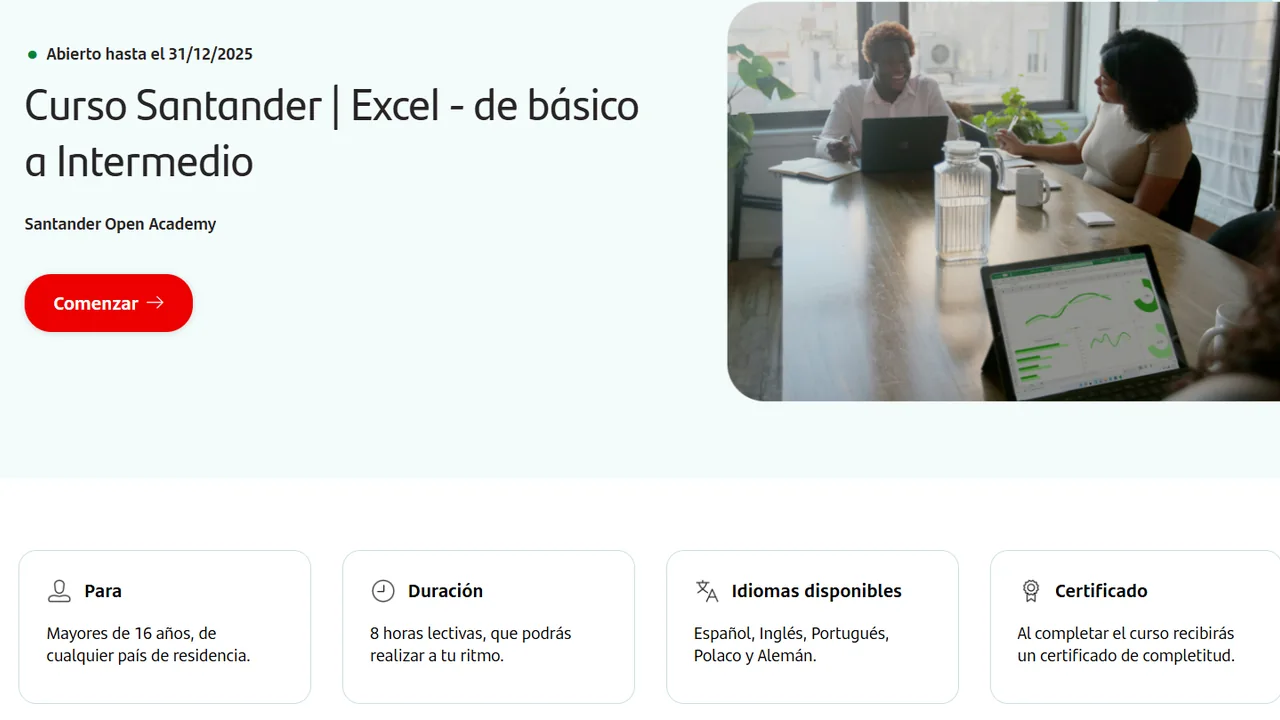 El Banco Santander ofrece este curso a través de su plataforma Santander Open Academy. Tiene una duración de 8 horas que puedes completar a tu ritmo. Lo mejor es que no cuesta absolutamente nada, ni siquiera el certificado.