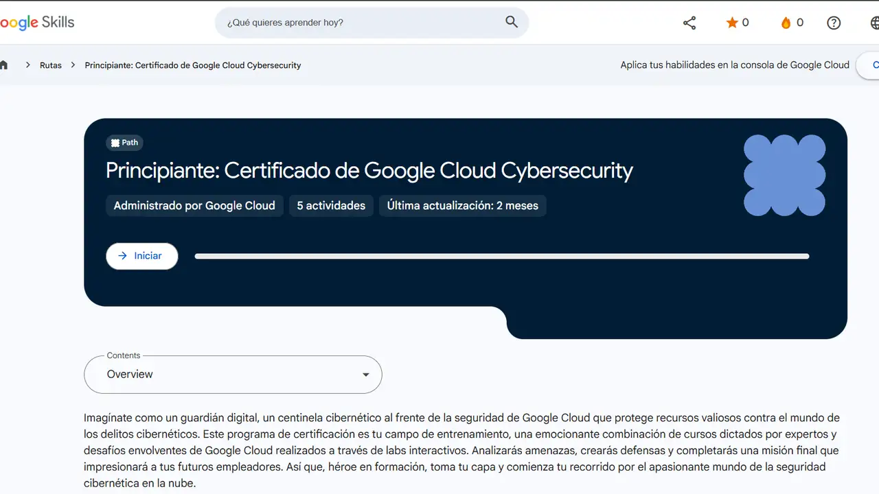 El Certificado de Google Cloud Cybersecurity es un curso en español, con inscripción disponible sin costo. El curso es para principiantes y se estructura en cinco lecciones progresivas.