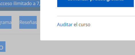 La segunda opción es elegir “auditar curso”, con esta opción podrás acceder al contenido de video del curso, pero no podrás realizar los exámenes ni obtener el certificado de finalización. Si no ves la opción de auditar curso, debes verificar en la parte de abajo usando el scroll (en forma de link).