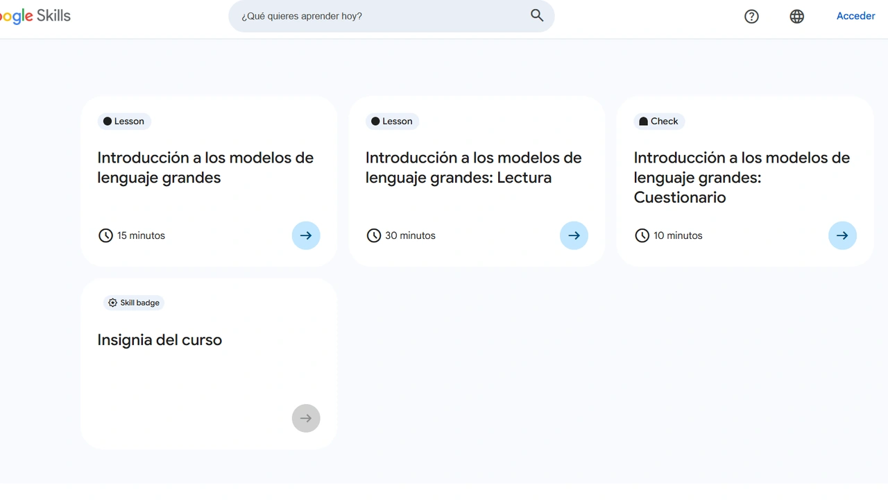 El curso gratis de LLMs está disponible en Google Cloud Skills Boost, Google Skills, Coursera y edX. Su duración va de 10 minutos a 1 hora, dependiendo del ritmo personal. Esto ayuda a comprender los conceptos sin saturarse.