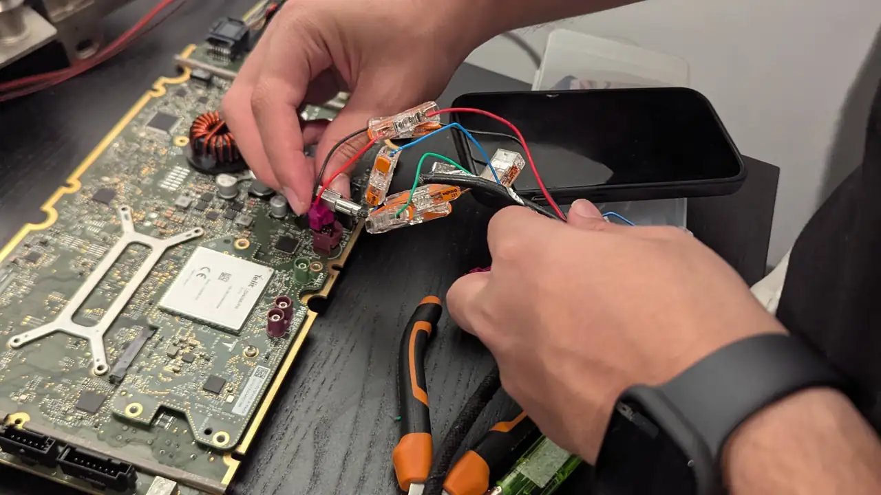 Uno de los desafíos técnicos fue conseguir el haz de cables correcto para alimentar y conectar los componentes, ya que Tesla no vende cables individuales, sino conjuntos completos que integran muchas conexiones.