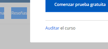 La segunda opción es elegir “auditar curso”, con esta opción podrás acceder al contenido de video del curso, pero no podrás realizar los exámenes ni obtener el certificado de finalización. Si no ves la opción de auditar curso, debes verificar en la parte de abajo usando el scroll (en forma de link).