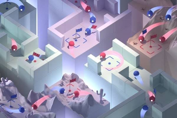 El escenario es sencillo: Dos equipos de agentes enfrentados en un juego de escondite. El sistema de recompensas se basa en puntos positivos y negativos, +1 para «encontrar/escapar», o -1 si «no encuentran nada/son vistos». Con una acumulación inicial de victorias por parte de los buscadores (rojo), el equipo azul comenzó a utilizar y fijar bloques para tapar las entradas, creando un escondite colaborativo. Después de varias generaciones, los buscadores también aprendieron a usar herramientas, moviendo rampas para saltar la pared y localizar a sus oponentes.