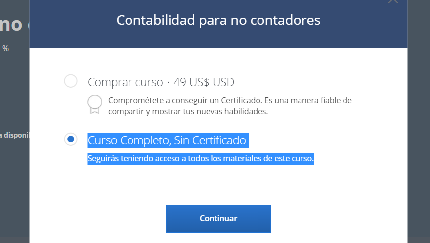 La primera opción es elegir la opción de “Curso gratuito sin certificado”, de esta manera podrás acceder al contenido del curso y finalizarlo, pero no podrás obtener un certificado de finalización avalado por la plataforma.