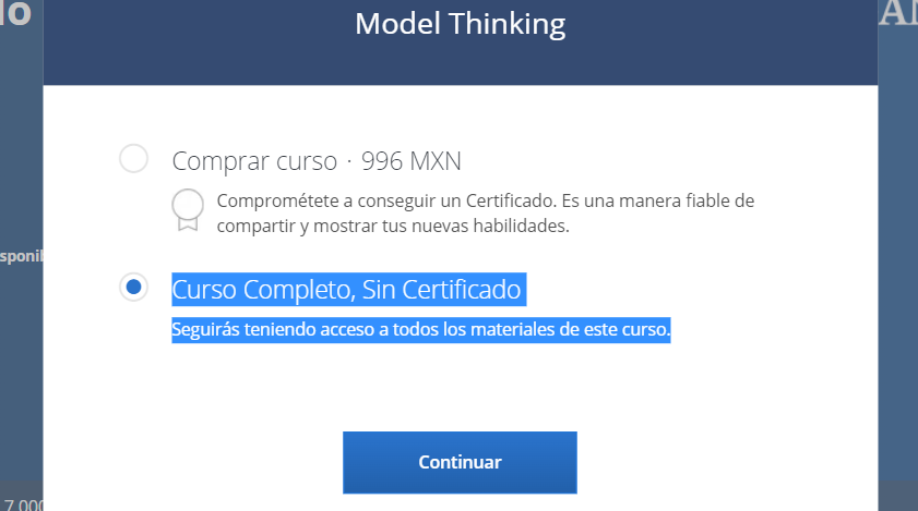 La segunda opción es elegir “auditar curso”, con esta opción podrás acceder al contenido de video del curso, pero no podrás realizar los exámenes ni obtener el certificado de finalización. Si no ves la opción de auditar curso, debes verificar en la parte de abajo usando el scroll (en forma de link).