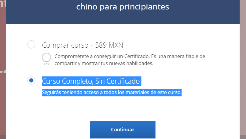 La primera opción es elegir la opción de “Curso gratuito sin certificado”, de esta manera podrás acceder al contenido del curso y finalizarlo, pero no podrás obtener un certificado de finalización avalado por la plataforma.