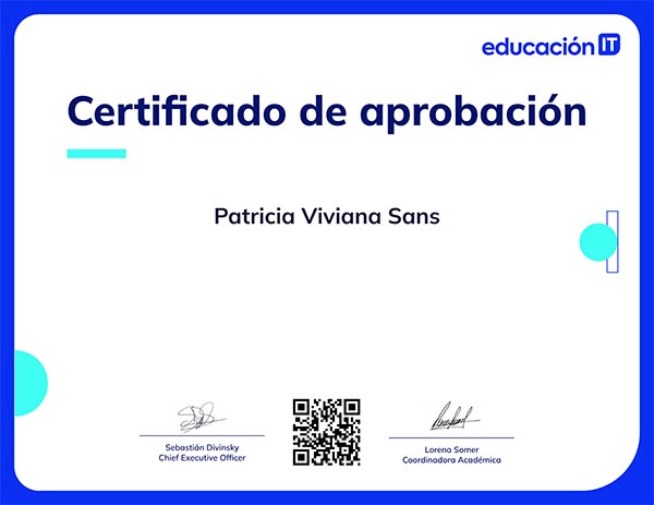 Al terminar, podrás obtener un certificado oficial de EducacionIT válido en toda Latinoamérica. Este documento sirve para demostrar tus habilidades ante empleadores o para formar a tu propio equipo de trabajo.