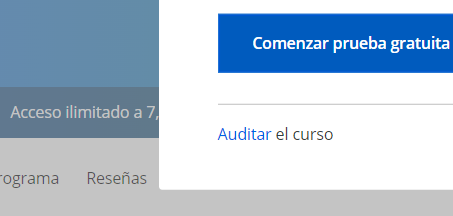 La segunda opción es elegir “auditar curso”, con esta opción podrás acceder al contenido de video del curso, pero no podrás realizar los exámenes ni obtener el certificado de finalización. Si no ves la opción de auditar curso, debes verificar en la parte de abajo usando el scroll (en forma de link).