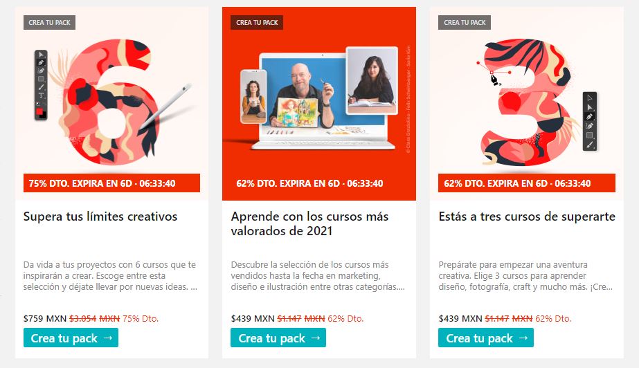 Estos paquetes de cursos, agrupan varios cursos similares, en el cual obtienes un descuento, generalmente entre el 50% y el 70% de descuento en el precio. Es decir, que puedes adquirir, por ejemplo, tres cursos relacionados sobre creatividad en 3D por $22 dólares.