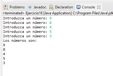 System.out.println("Los números son:");Y para mostrarlos en el orden ingresado, usaremos otro for igual al anterior, empezando en 0, mientras sea menor a 5 y de 1 en 1.